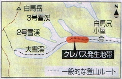 北アルプス白馬岳(2932b)の白馬大雪渓に長さ約100b、深さ約15b、幅約5bのクレバス(雪の裂け目)が現れ、登山者を驚かせている。北ア北部地区山岳遭難防止対策協会によると、この時期に見られるのは異例。3日は今季最多の約千人が北安曇郡白馬村猿倉から大雪渓に入山しており、遭対協隊員らが安全な道を確保した。