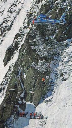 写真:奥穂高岳の長野県側で県警ヘリコプターに救助される登山者=6日午後2時59分