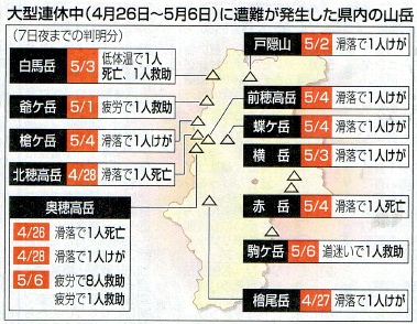 全国で大型連休中に山の事故で死亡した人は、青森、福島県で山菜採りに入った男女各1人、山形県の飯豊山、神奈川県の大山、富山県の北ア剣岳、雄山、富士ノ折立、岐阜県の川上岳、涸沢岳、静岡県の富士山で滑落した人ら14人、長野県の奥穂高岳、北穂高岳、白馬岳、八ヶ岳連峰・赤岳で滑落した人ら4人を含め少なくとも計18人。