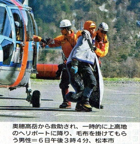 上高地のヘリポートでは午後3時すぎ、最初に救助された男性が病院搬送の前にいったん降ろされ、疲れた様子でしばらく地面に座り込んでいた。同4時.10分ごろ、最後の3人が到着。1人は「大丈夫ですか」との問い掛けにうなずき、「低体温症の人を置いて帰って来るわけにいかなかった」と話し、足早に松本署のワゴン車に乗り込んだ。