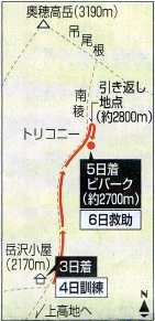 松本署によると、14人が3日に上高地から入山し、岳沢小屋近くを拠点に訓練。うち佐久、大町、安曇野、駒ヶ根市、下高井郡、北安曇郡の県内の6人と郡山、南アルブス市の2人を合わせた20〜60代8人が5日に奥穂高岳を目指したが、天候悪化や疲労で5人が動けなくなった。このため8人はトリコニーと呼ばれる岩場にビバークした。